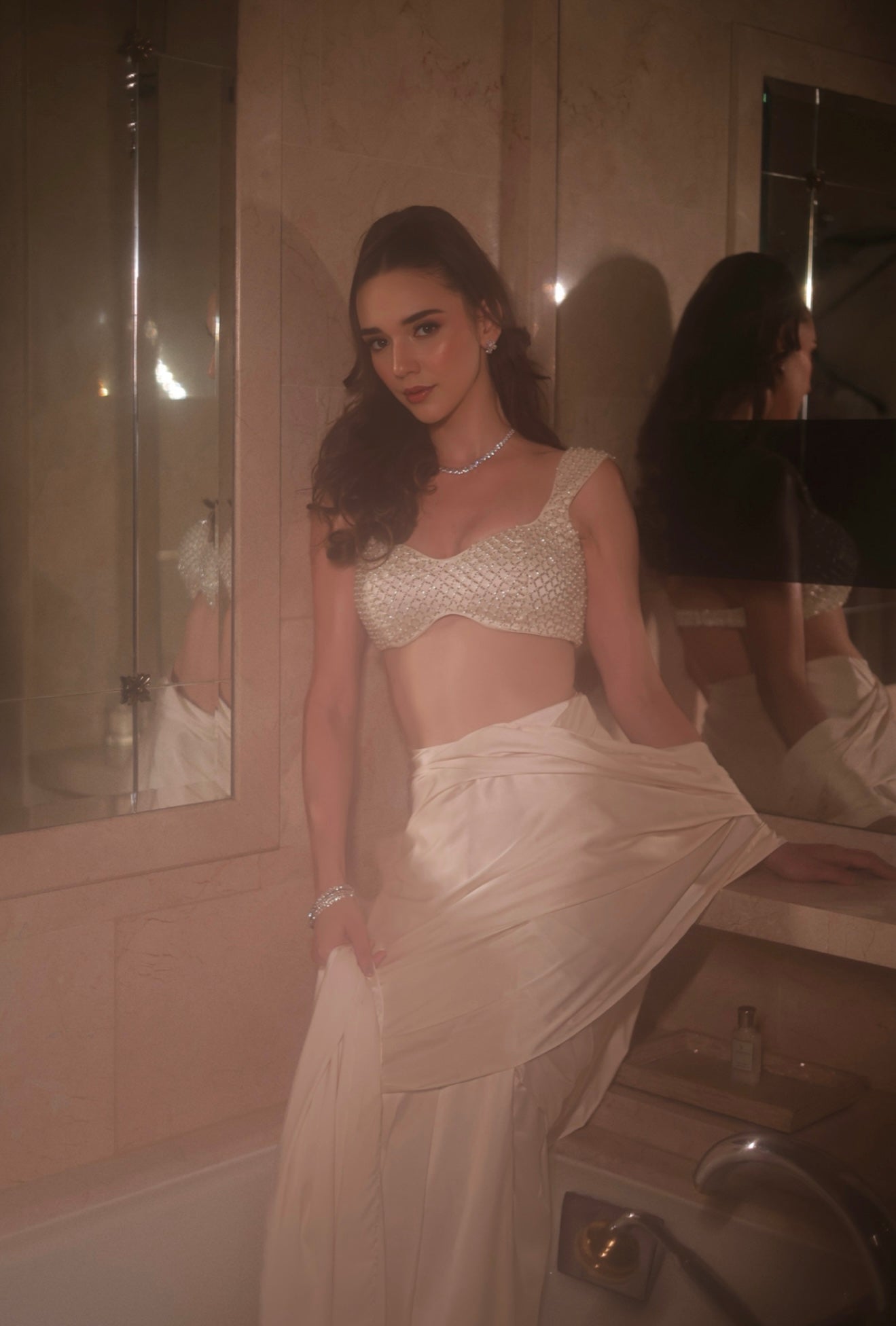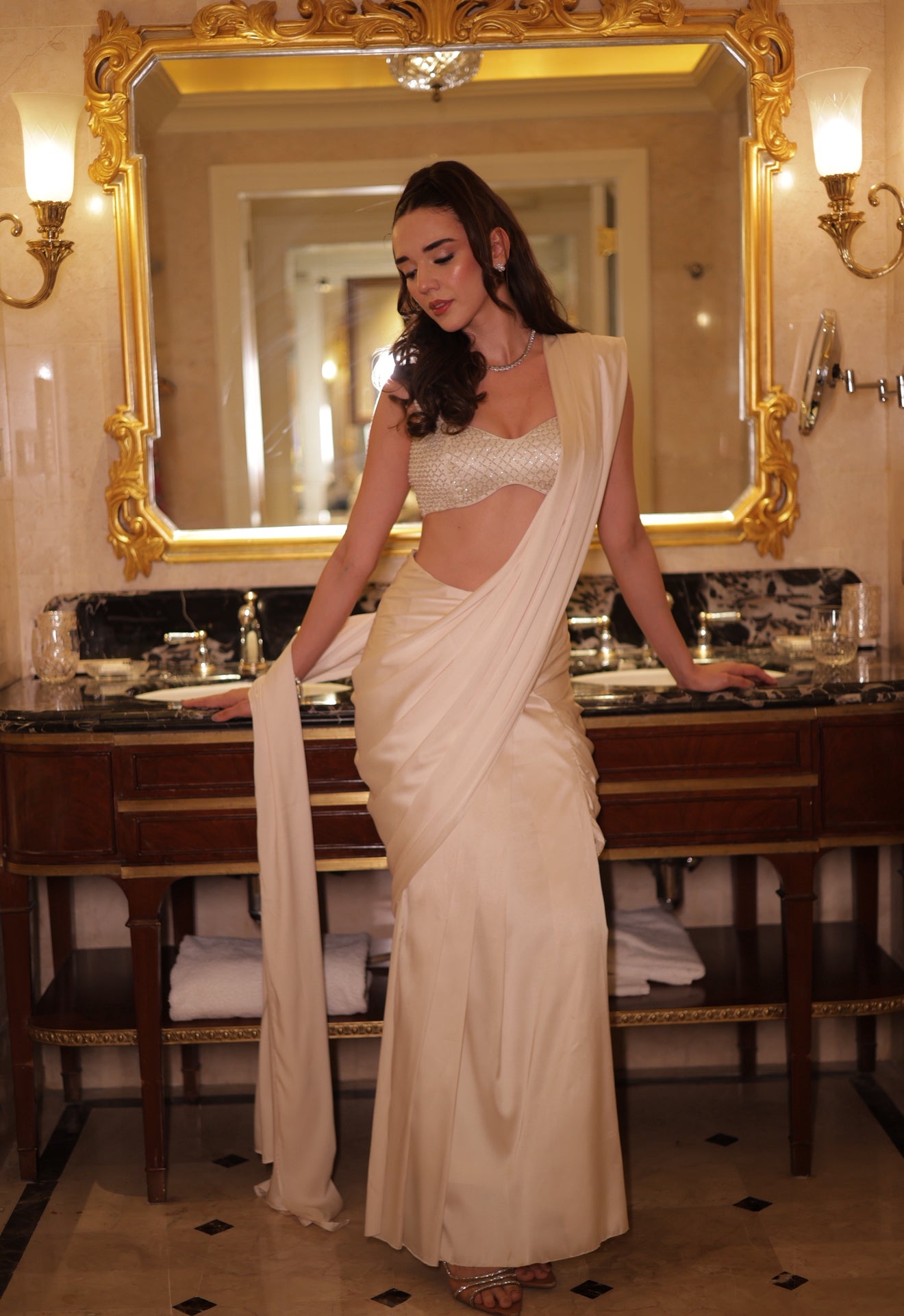 A vision of ethereal grace, this pre-draped saree shimmers with intricate beadwork and fluid elegance. Reflecting the “Dream Escape” spirit, it blends lightness, beauty, and timeless allure for the modern woman of effortless sophistication.