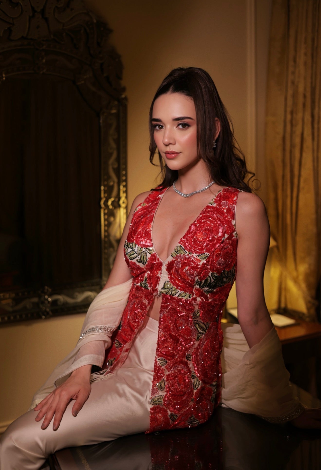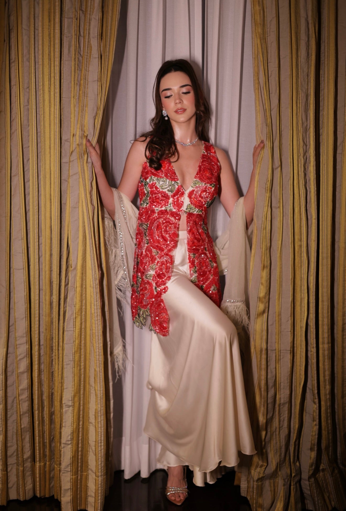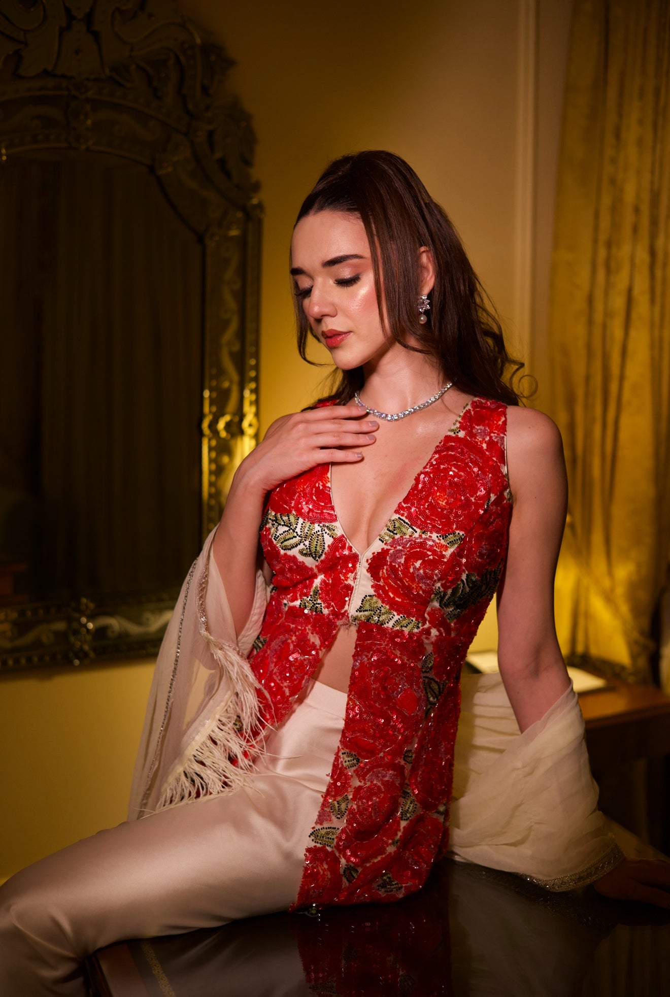 A poetic blend of elegance and artistry, this ensemble from the “Dream Escape” collection features richly embroidered crimson roses, a flowy Sharara, and a silver-edged Dupatta with feathered accents — capturing lightness, luxury, and timeless grace.